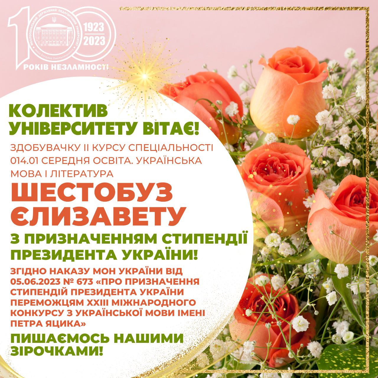 Колектив Мелітопольського державного педагогічного університету імені Богдана Хмельницького щиро вітає здобувачку ІІ курсу спеціальності 014.01 Середня освіта. Українська мова і література ШЕСТОБУЗ ЄЛИЗАВЕТУ з призначенням СТИПЕНДІЇ ПРЕЗИДЕНТА УКРАЇНИ!