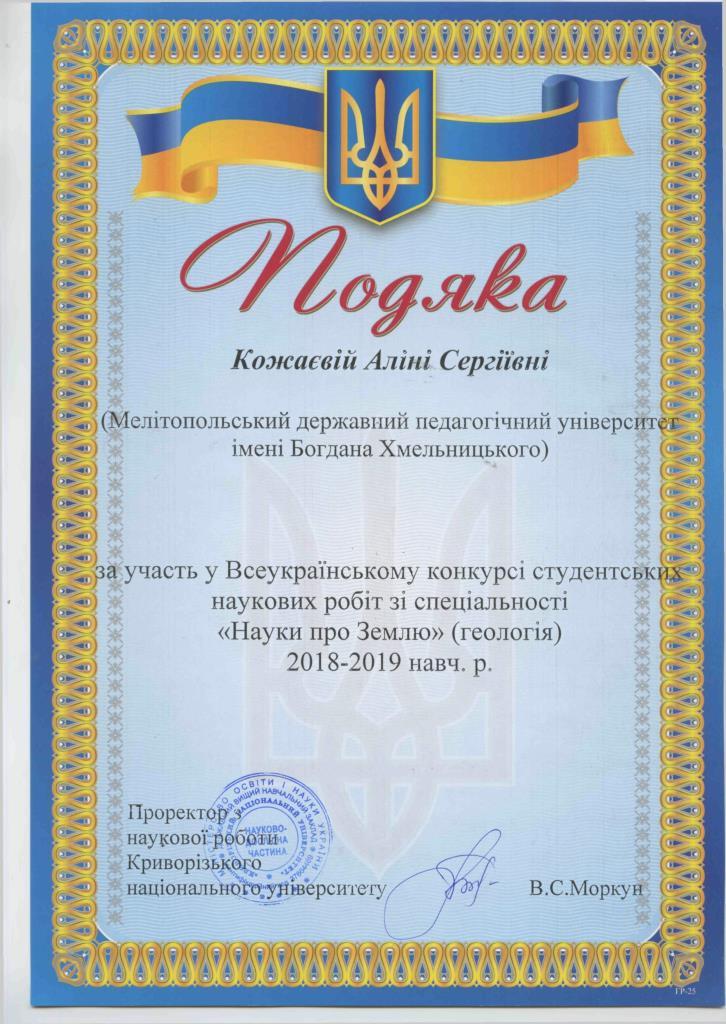 За результатами попереднього відбору наукових робіт на конкурс була запрошена студентка 116-п групи природничо-географічного факультету спеціальності 014.07 Середня освіта (Географія) Кожаєва Аліна. Вона представила наукову роботу за темою «Сучасна динаміка схилів північного узбережжя Азовського моря (на прикладі Ботієвської ділянки)» (науковий керівник: старший викладач кафедри фізичної географії і геології Непша О.В.).