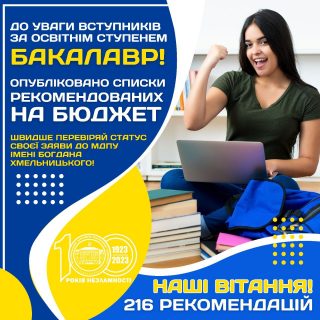 Вітаємо 216 ВСТУПНИКІВ, які отримали РЕКОМЕНДАЦІЇ ДО ЗАРАХУВАННЯ НА БЮДЖЕТ ДО МДПУ імені Богдана Хмельницького!