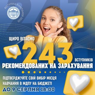 🥳🇺🇦 Вітаємо 243 ВСТУПНИКІВ, які отримали РЕКОМЕНДАЦІЇ ДО ЗАРАХУВАННЯ НА БЮДЖЕТ ДО МДПУ імені Богдана Хмельницького!