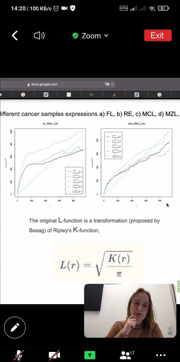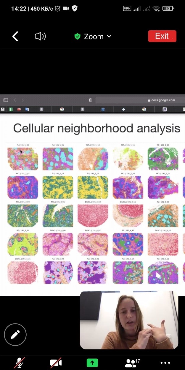 Доповідь за результатами наукових досліджень на тему «Applying computational methods to highly multiplexed immunohistochemistry data to profile the microenvironment in B-cell lymphoma» зробила науковий співробітник-стажер цієї лабораторії Anastasiia Horlova, яка входить до складу наукового центру Huber Group – Quantitative Biology and Statistics (https://www.embl.org/groups/huber/). Були показані методики та результати досліджень злоякісних пухлин людини на клітинному та молекулярно-генетичному рівнях.