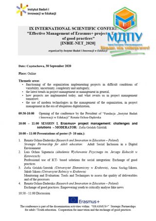 ІХ Міжнародна наукова конференція «Ефективний менеджмент проектів Erasmus+: обмін кращими практиками», Інститут досліджень та інновацій в освіті, Польща.
