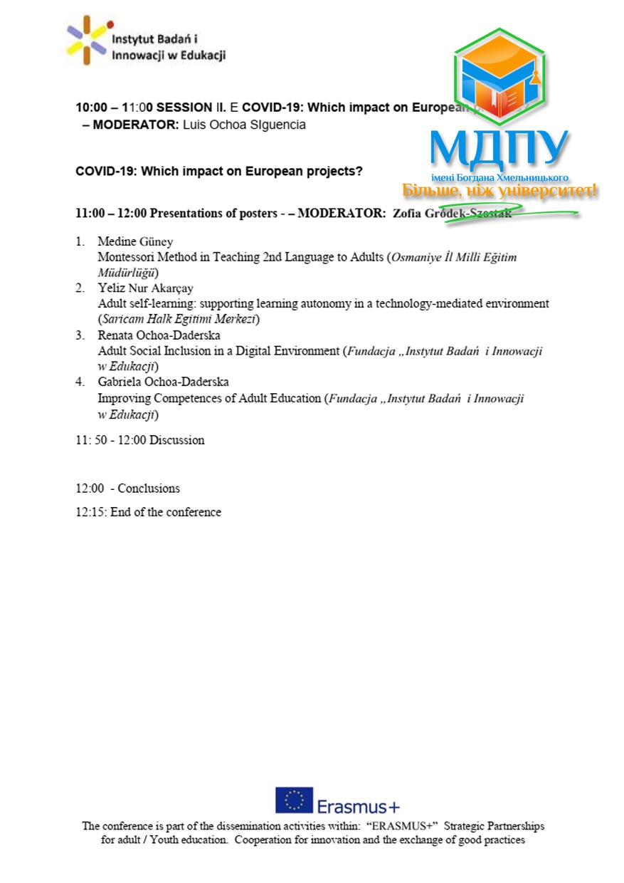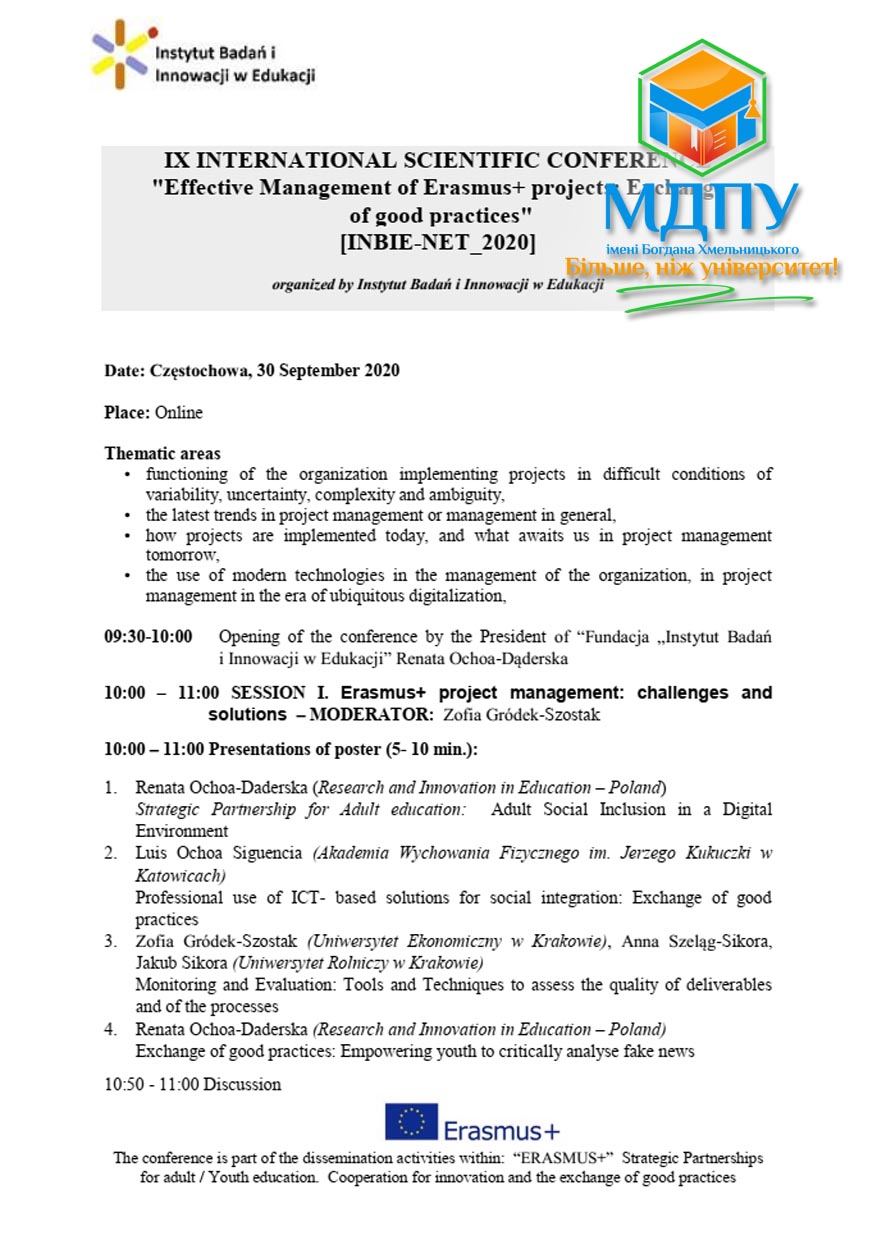 ІХ Міжнародна наукова конференція «Ефективний менеджмент проектів Erasmus+: обмін кращими практиками», Інститут досліджень та інновацій в освіті, Польща.
