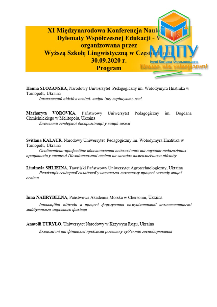 29 вересня розпочався завершальний етап програми стажування науково-педагогічних працівників та аспірантів МДПУ імені Богдана Хмельницького у дистанційному форматі на базі Вищої Школи Лінгвістичної, м.Ченстохова, Польща.