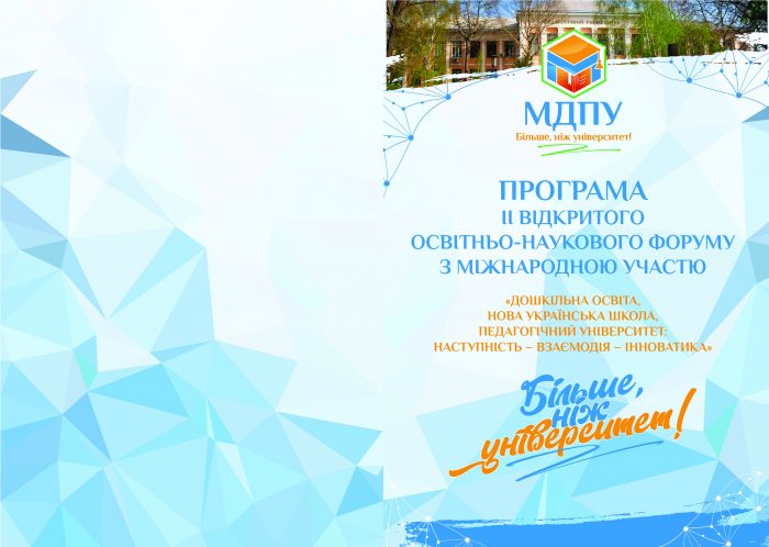 Запрошуємо до співпраці вчених, науково-педагогічних працівників закладів вищої освіти, вихователів, логопедів закладів дошкільної освіти, учителів закладів загальної середньої освіти, представників формальної і неформальної освіти, аспірантів, докторантів, здобувачів вищої освіти до участі у ІІ Відкритому освітньому форумі з міжнародною участю «Дошкільна освіта, Нова українська школа, педагогічний університет: наступність – взаємодія – інноватика», що відбудеться на базі Мелітопольського державного педагогічного університету імені Богдана Хмельницького 23 вересня 2020 року (вул. Гетьманська, 20, навчальний корпус №1).