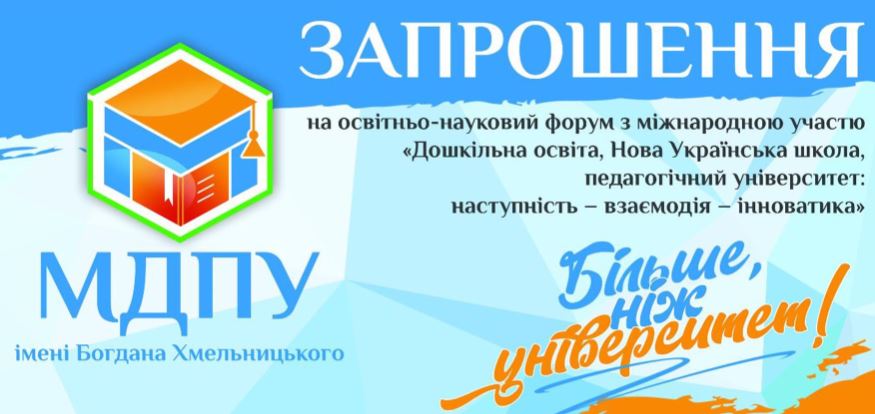 Запрошуємо до співпраці вчених, науково-педагогічних працівників закладів вищої освіти, вихователів, логопедів закладів дошкільної освіти, учителів закладів загальної середньої освіти, представників формальної і неформальної освіти, аспірантів, докторантів, здобувачів вищої освіти до участі у ІІ Відкритому освітньому форумі з міжнародною участю «Дошкільна освіта, Нова українська школа, педагогічний університет: наступність – взаємодія – інноватика», що відбудеться на базі Мелітопольського державного педагогічного університету імені Богдана Хмельницького 23 вересня 2020 року (вул. Гетьманська, 20, навчальний корпус №1).
