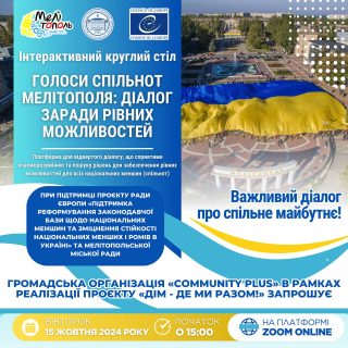 🇪🇺🤝🏻При підтримці Проєкту Ради Європи «Підтримка реформування законодавчої бази щодо національних меншин та зміцнення стійкості національних менших і ромів в Україні», Мелітопольської міської ради, Громадська організація «Community plus» в рамках реалізації проєкту «ДІМ – ДЕ МИ РАЗОМ!» в партнерстві з Центром соціологічних досліджень Мелітопольського державного університету імені Богдана Хмельницького запрошує всіх бажаючих взяти участь в роботі інтерактивного круглого столу 🇺🇦🍒 «ГОЛОСИ СПІЛЬНОТ МЕЛІТОПОЛЯ: ДІАЛОГ ЗАРАДИ РІВНИХ МОЖЛИВОСТЕЙ»
