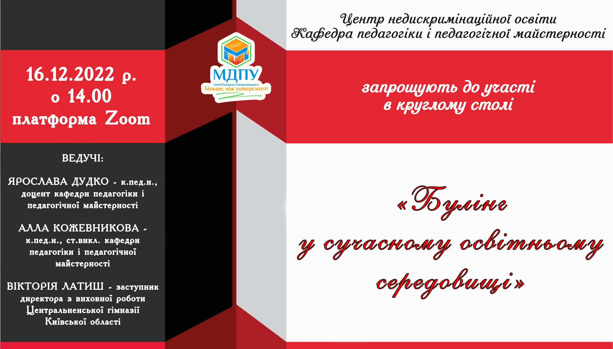 Центр недискримінаційної освіти, кафедра педагогіки і педагогічної майстерності Мелітопольського державного педагогічного університету імені Богдана Хмельницького запрошують до участі в круглому столі «Булінг у сучасному освітньому середовищі».