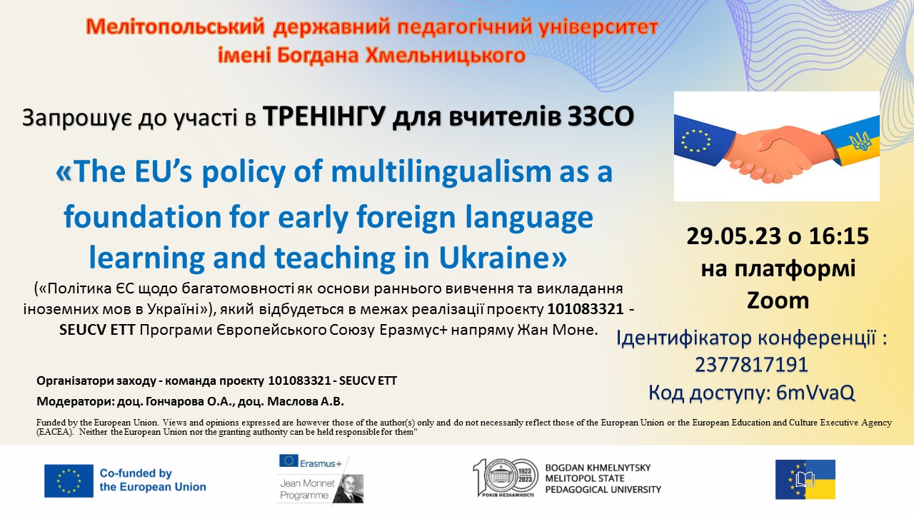 ТРЕНІНГ «The EU’s policy of multilingualism as a foundation for early foreign language learning and teaching in Ukraine», який відбудеться в межах реалізації проєкту 101083321 – SEUCV ETT Програми Європейського Союзу Еразмус+ напряму Жан Моне. (29.05.2023 р., онлайн).