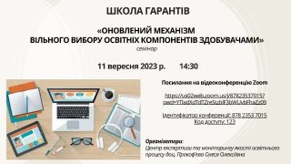Запрошуємо гарантів на семінар “Школи гарантів” на тему “ОНОВЛЕНИЙ МЕХАНІЗМ ВІЛЬНОГО ВИБОРУ ОСВІТНІХ КОМПОНЕНТІВ ЗДОБУВАЧАМИ”
