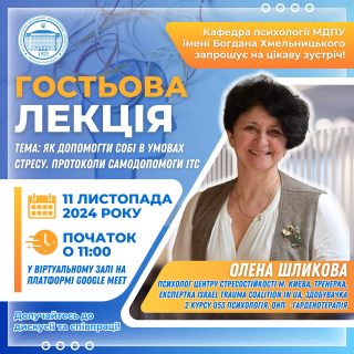 Кафедра психології Мелітопольського державного педагогічного університету імені Богдана Хмельницького запрошує на гостьову лекцію «Як допомогти собі в умовах стресу. Протоколи самодопомоги ІТС»