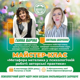 🏛️⭐️Психологічний центр МДПУ імені Богдана Хмельницького запрошує на майстер-клас: «Метафора метелика у психологічній роботі: авторські практики»