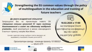 ✅🙋🏻♀️ 18 лютого 2025 року команда виконавців грантового проєкту «Зміцнення спільних цінностей ЄС через політику багатомовності в освіті та підготовці майбутніх учителів»/ «Strengthening the EU common values through the policy of multilingualism in the education and training of future teachers» 101083321 — SEUCV ETT — ERASMUS-JMO-2022-HEI-TCH-RSCH за міжнародною програмою Еразмус+ розпочинає імплементацію третього циклу проєкту.