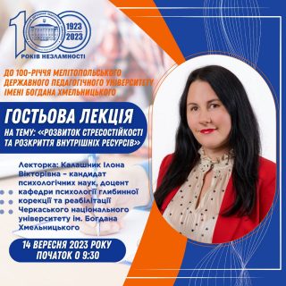 До 100-річчя Мелітопольського державного педагогічного університету імені Богдана Хмельницького 14 вересня 2023 року о 9:30 запрошуємо стати учасником гостьової лекції на тему: «Розвиток стресостійкості та розкриття внутрішніх ресурсів».