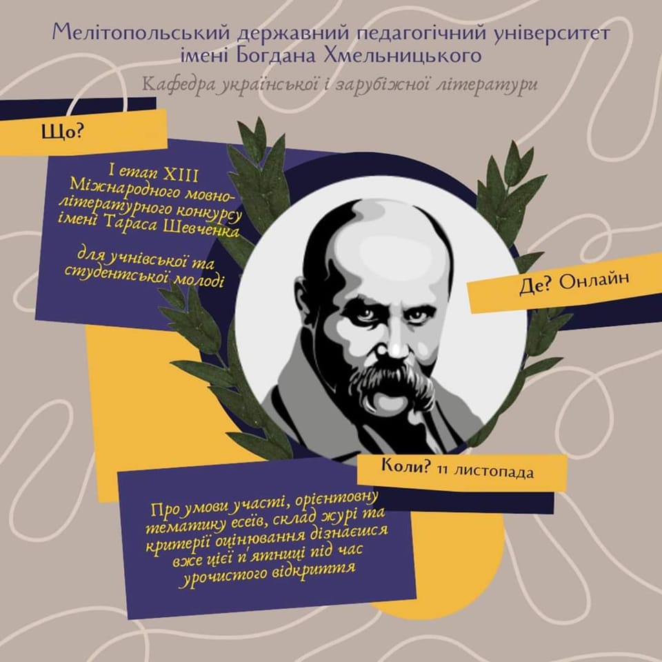 Шановні здобувачі Мелітопольського державного педагогічного університету імені Богдана Хмельницького, запрошуємо вас взяти участь у І етапі ХІІІ Міжнародного мовно-літературного конкурсу учнівської та студентської молоді імені Тараса Шевченка, що розпочинається 11 листопада 2022 року.