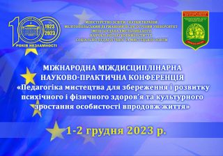 Запрошуємо Вас взяти участь у Міжнародній міждисциплінарній науково-практичній конференції «Педагогіка мистецтва для збереження і розвитку психічного і фізичного здоров’я та культурного зростання особистості впродовж життя», яка відбудеться 1-2 грудня 2023 р.