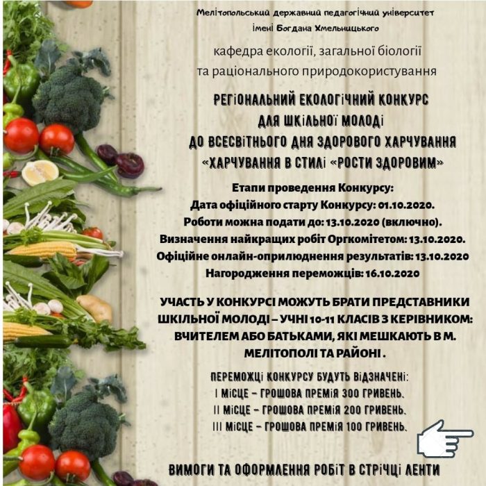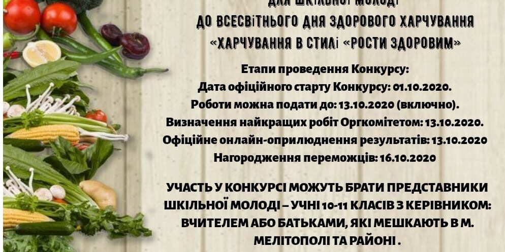 Запрошуємо взяти участь в регіональному екологічному конкурсі для шкільної молоді до Всесвітнього дня здорового харчування «Харчування в стилі «рости здоровим»