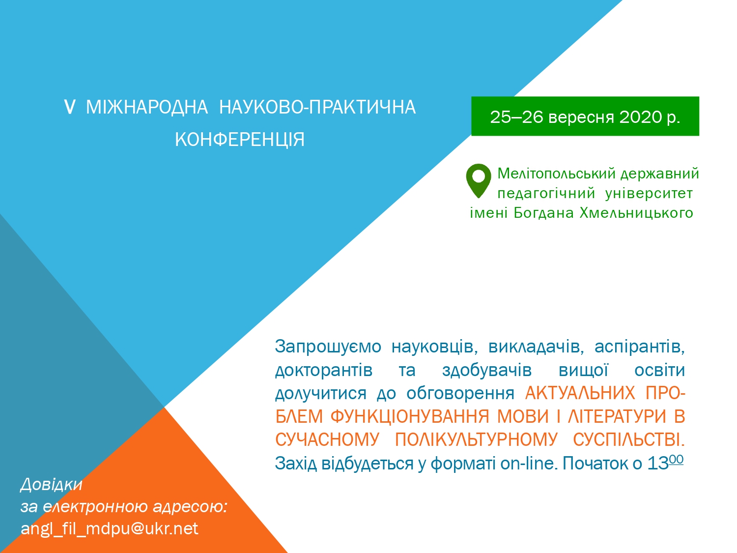 Вер212020Новини університету Post Views: 98 Category: Новини університетуВід mdpu_supervisor21.09.2020Leave a comment Author: mdpu_supervisor Post navigationПопереднійПопередній пост:Прагнемо неба, де літають голуби!NextNext post:Запрошуємо до участі у ІІ Відкритому освітньому форумі «Дошкільна освіта, Нова українська школа, педагогічний університет: наступність – взаємодія – інноватика»Related PostsМІЖНАРОДНИЙ ДЕНЬ ЗАПОБІГАННЯ ЕКСПЛУАТАЦІЇ НАВКОЛИШНЬОГО СЕРЕДОВИЩА ПІД ЧАС ВОЄННИХ І ЗБРОЙНИХ КОНФЛІКТІВ06.11.2025УСПІШНИЙ СТАРТ В АСПІРАНТУРІ: РЕКОМЕНДАЦІЇ ЩОДО СКЛАДАННЯ ІНДИВІДУАЛЬНОГО ПЛАНУ06.11.2025МРІЙ. ДІЙ. ПЕРЕМАГАЙ РАЗОМ З МДПУ!06.11.2025ЗАПРОШУЄМО ВЗЯТИ УЧАСТЬ У РОБОТІ КОНФЕРЕНЦІЇ!06.11.2025ВОРКШОП “ІДЕЇ ДЛЯ УРОКІВ МАЙБУТНЬОГО” — ОСВІТНІЙ ПРОСТІР ІННОВАЦІЙ ТА ПРОФЕСІЙНОГО ЗРОСТАННЯ!05.11.2025ВІТАЄМО З ПЕРЕМОГОЮ!05.11.2025