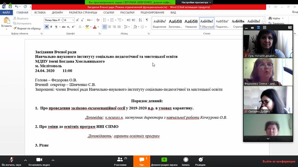 На засіданні було розглянуто питання щодо проведення заліково-екзаменаційної сесії у 2019-2020 н.р. в умовах карантину. Заступник директора інституту Кочкурова О.В. зазначила основні організаційні моменти, механізми здійснення заліків та іспитів під час сесії, відповіла на питання членів Вченої ради з цього приводу. Гаранти освітніх програм надали інформації щодо внесення обґрунтованих змін до відповідних освітніх програм ННІ СПМО. Наприкінці заходу учасниками обговорено перспективні напрями подальшої роботи.