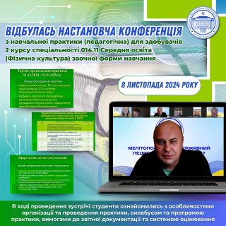 🏛️📚8 листопада 2024 року на факультеті фізичної культури, спорту та психології була проведена настановча конференція з навчальної практики (педагогічна) для здобувачів 2 курсу спеціальності 014.11 Середня освіта (Фізична культура) заочної форми навчання.