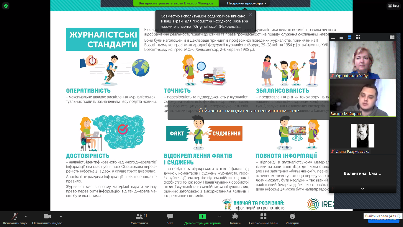 Захід модерувала Тетяна Коноваленко за підтримки всієї команди Хабу інфомедійно-грамотних громадян. Наприкінці зустрічі вона наголосила на важливості бути медіаграмотною особою в умовах сучасного інформаційного буму.