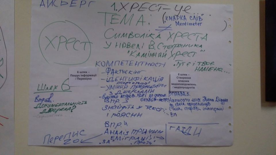 Ключовою темою всіх днів Зимової школи була тема «Інтеграція інфо-медійної грамотності в навчальні програми: методологія IREX». Завдяки креативним та обізнаним тренеркам проекту Олені Тараненко та Тетяні Матичак, вдалося дізнатися методичні секрети подвійної імплементації інфо-медійної грамотності у навчальні предмети. Було дуже креативно, динамічно та професійно! Учасники методом мозкового штурму склали карту компетентностей, починаючи генерувати ідеї від окремих умінь, систематизуючи до рівня таких компетентностей як: інформаційна грамотність, критичне мислення, цифрова безпека, соціальна толерантність, візуальна грамотність, стійкість до впливів, фактчек, інноваційність, розвиток креативності, медіаграмотність. Методом брейнстормінгу спробували запропонувати методи (способи) інтеграції компетентностей в шкільну програму. На підставі цих способів вивели шляхи впровадження медіаграмотності. Після аналізу усіх шляхів та можливих вправ для формування певних компетентностей, кожній групі учасників запропоновано концепт на вибір: дорога, дерево, хрест, дитинство. Необхідно було домовитись в групі на якому навчальному предметі буде застосовано цей концепт. Обрати тему, де може вивчатися даний концепт. Методом жеребкування обрали 3 шляхи інтеграції та визначили компетентності, що будуть формуватися у темі. Відповідно підібрали вправи.