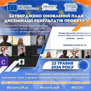 ✅📚23 травня 2024 року партнери проєкту затвердили оновлений План дисемінації результатів проєкту (BOOST Dissemination Plan), розроблений креативною командою викладачів МДПУ імені Богдана Хмельницького.